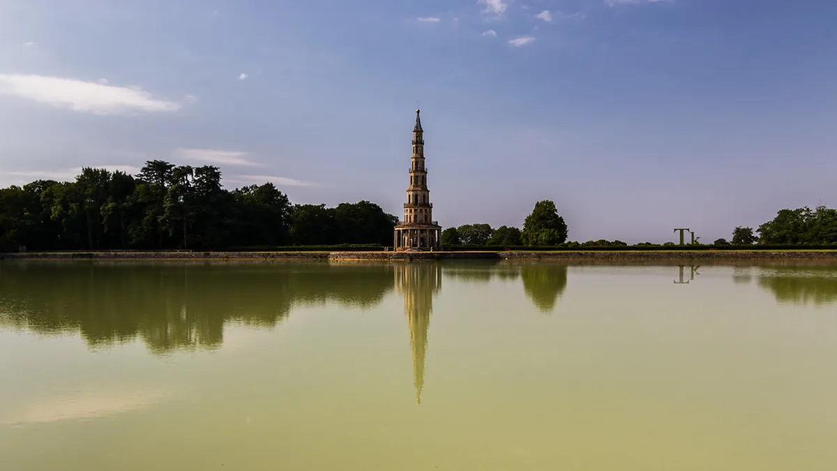 The Duke of Choiseul commissioned this pagoda after he was exiled from the royal court. He wanted a monument to symbolize his friendship with his loyal supporters. The tower originally overlooked a massive lake and a grand formal garden. Today, only the pagoda remains after the main chateau was demolished.