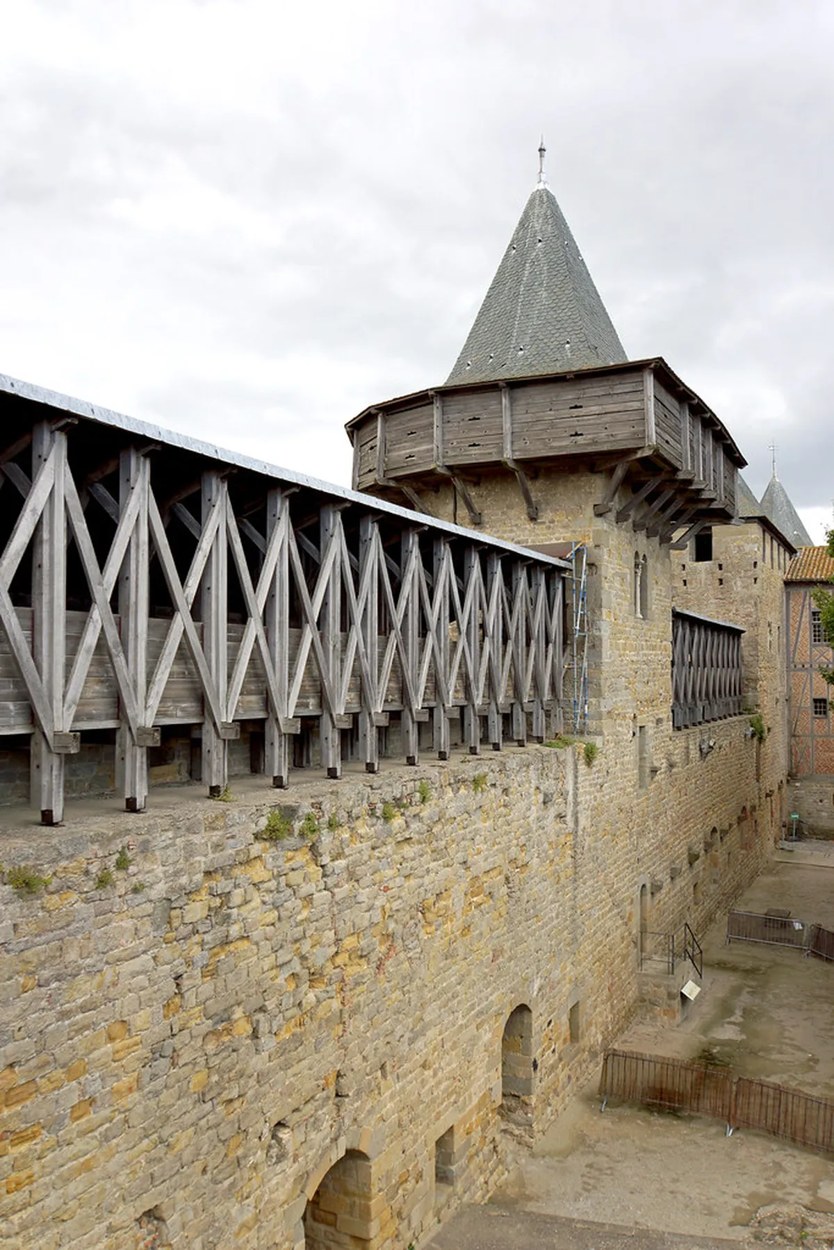 Medieval builders designed these galleries to be removable during times of peace. They typically sat on large wooden beams called joists. These beams fitted into square holes in the stone masonry. You can still see these holes, known as putlog holes, across the Cité walls. The galleries protected the stone curtains from being undermined by miners. They effectively removed the blind spots at the wall's foot. This made the Cité de Carcassonne fortifications nearly impossible to breach by direct assault.