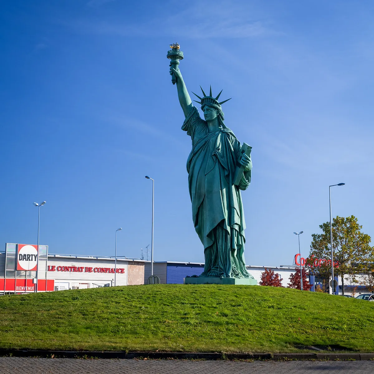 The exact Colmar Statue of Liberty replica location is on the Route de Strasbourg. It sits specifically at the northern gateway of the city. You will find it near the Colmar Houssen Airport. The statue stands in the center of a busy roundabout.