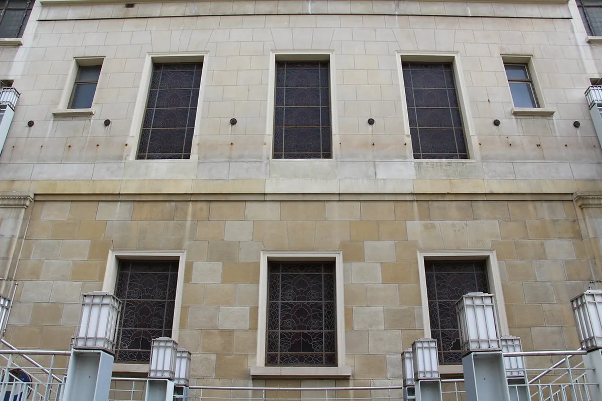 Another striking example is the former cinema building located near the middle of the street. It features a stunning facade with large vertical windows and decorative ceramic tiles. The neon signs often highlight the architectural lines once the sun sets in the evening. This building served as a hub for entertainment and modern culture during the interwar years.