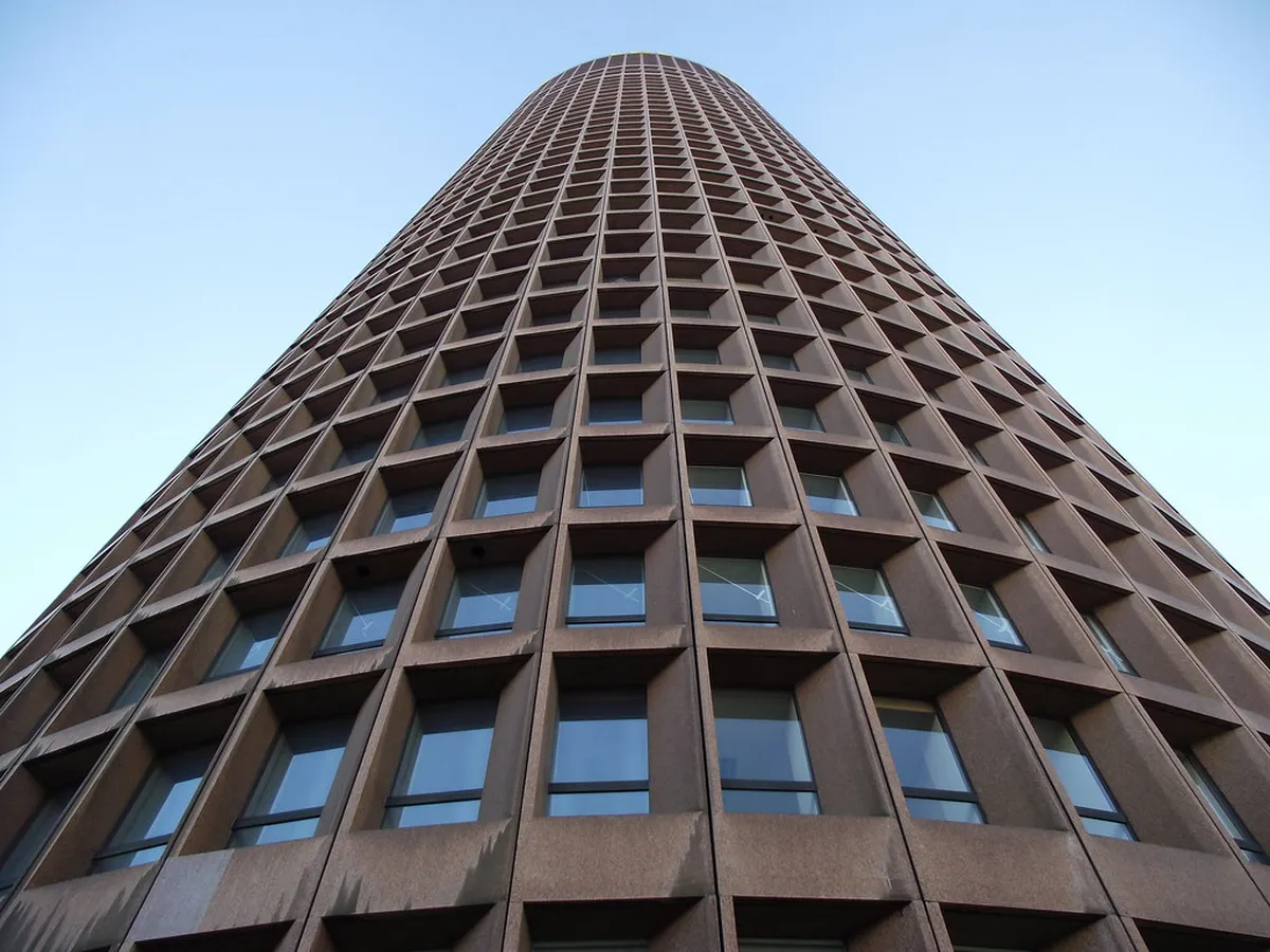 Araldo Cossutta designed the tower to stand as a singular monument within the flat urban landscape. The facade consists of precast concrete panels that feature a warm and light sandy brown color. These panels create a rhythmic pattern of windows that wraps entirely around the curved exterior walls. This circular layout provides every office floor with expansive and unobstructed views of the surrounding city.