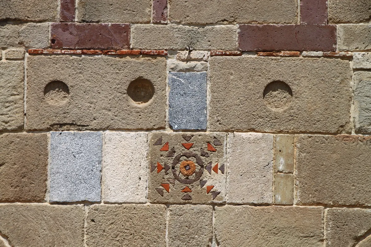 Stained glass windows filter the natural light into the hall. This creates a colorful glow on the ancient stone floors. The light changes throughout the day as the sun moves. It provides a peaceful setting for viewing modern art pieces.