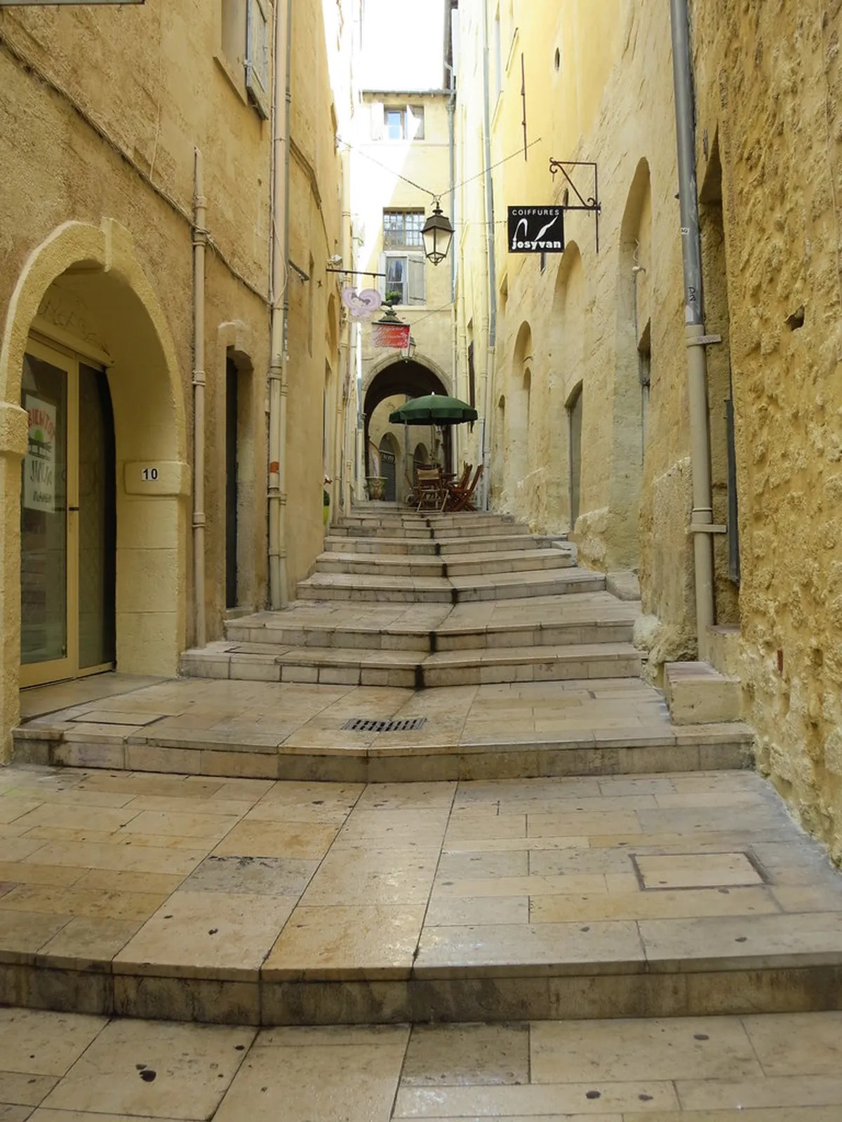 The vaulted arches create a rhythmic pattern that guides the eye upward toward the bright blue Mediterranean sky above. These features are typical of the architecture in Montpellier and appear in many hidden corners of the old town. Some arches connect two buildings across the street to provide extra stability against the movement of the earth. It creates a tunnel-like effect that makes the street feel like a secret world away from the city.