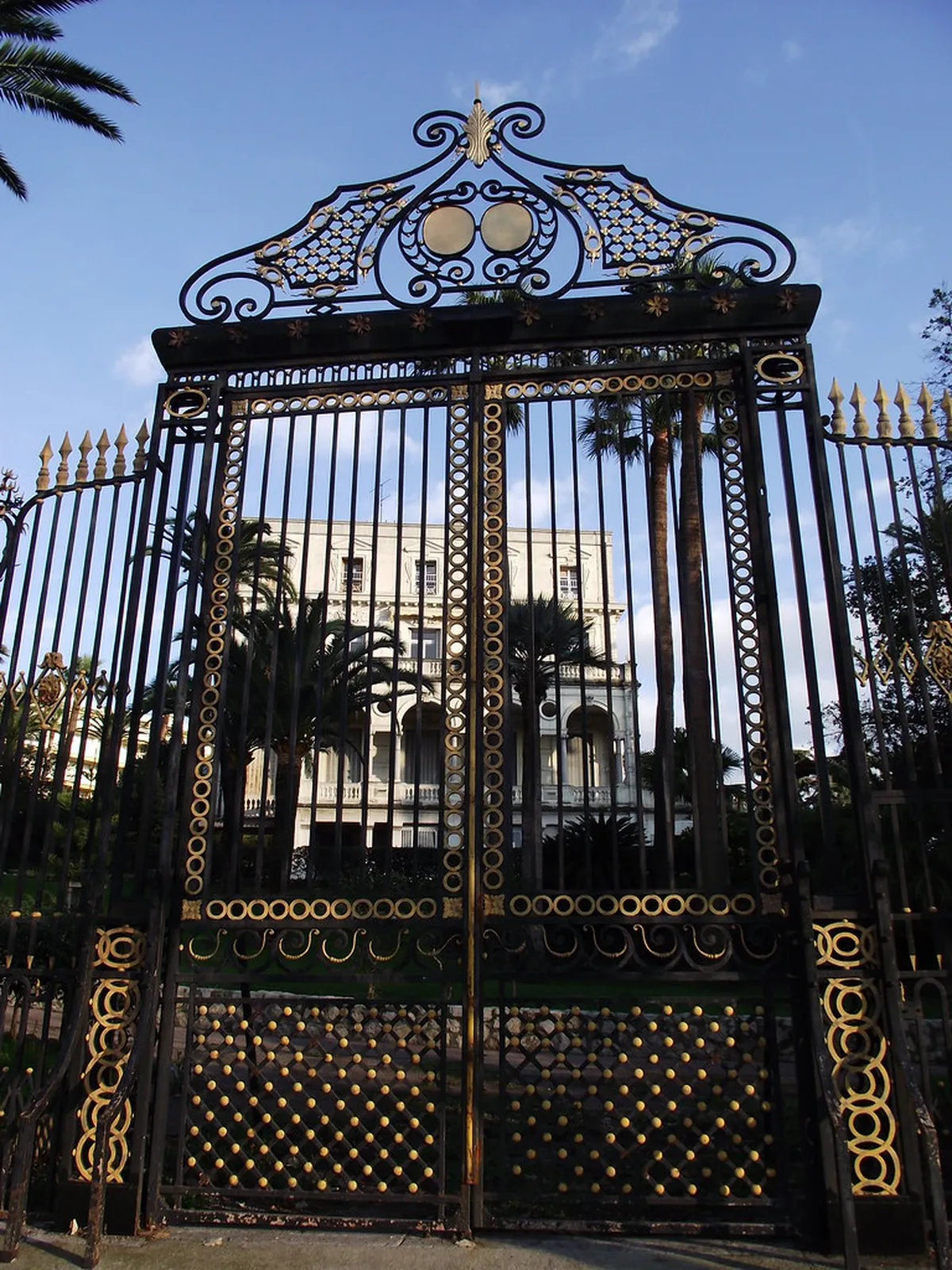This massive building features ornate white facades and ironwork. Its crown-like roof ornaments stand out against the blue sky. Many other villas in the area display similar Belle Époque architecture in Nice. These structures define the neighborhood's sophisticated character.